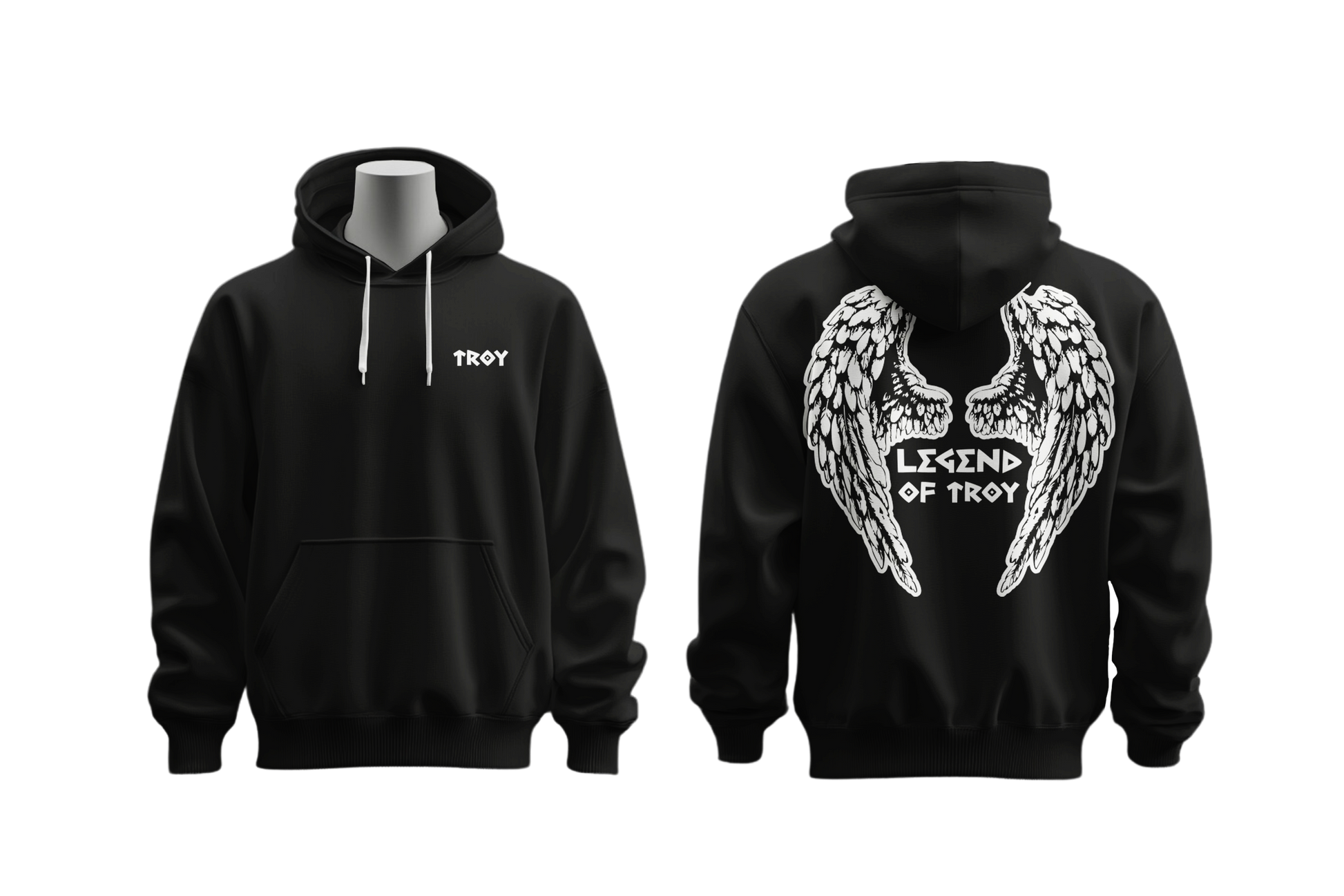 This hoodie keeps it minimal up front with a small “Troy” logo on the chest, then makes its statement on the back — “Legend of Troy” framed by massive white wings stretching across the entire back. Bold, clean, and impossible to ignore.